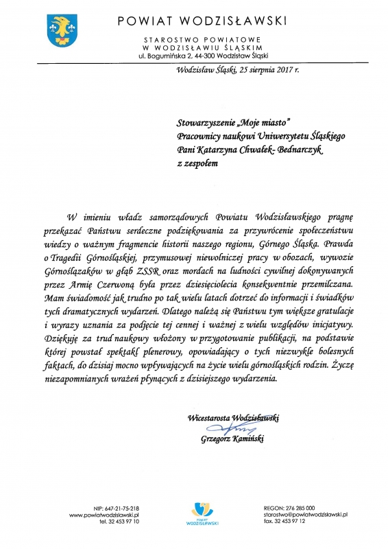 Podziękowania również kieruję dla profesora Kazimierza Miroszewskiego, dr Mateusza Sobeczko oraz pracownika Centrum Dokumentacji Deportacji Górnoślązaków do ZSRR w 1945 roku w Radzionkowie, którzy przed spektaklem przedstawili rys historyczny tzw. Tragedii Górnośląskiej.